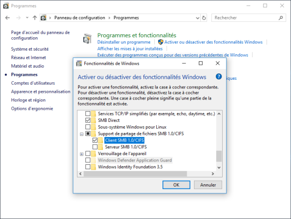 En attendant la mise à jour de ces services en SMBv2, ci-après la procédure pour réactiver le client SMBv1 sur Windows 10 :